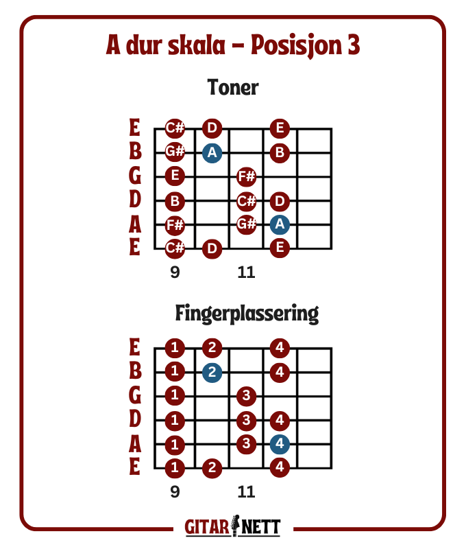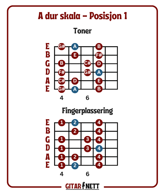 Her tar vi for oss hvordan man bygger opp A dur skalaen, og hvordan man kan spille denne skalaen på gitar.