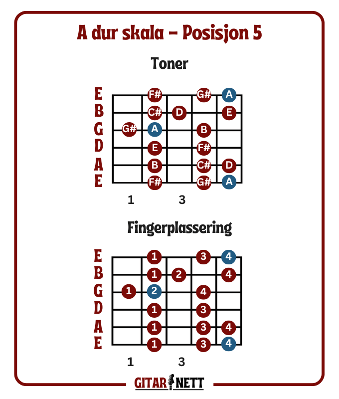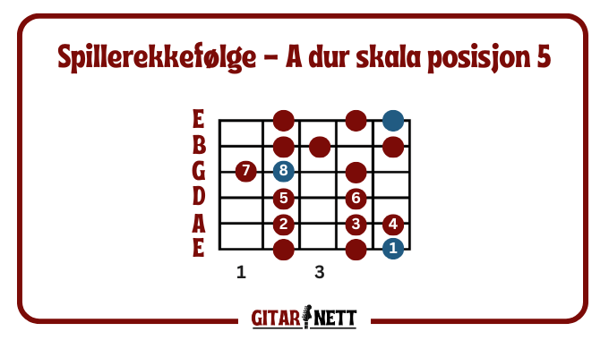 Posisjon 5 starter fra 1. bånd på gitarhalsen.