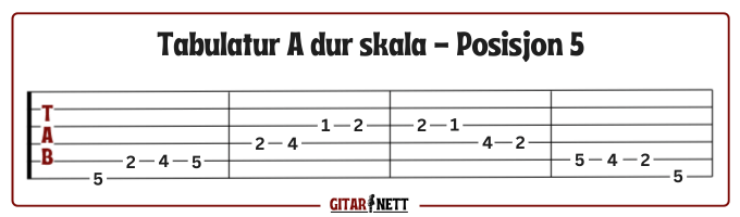 Her kan du se med et tabulatur hvordan du spiller deg igjennom skalaen på gitar. Vi har også her tatt utgangspunkt i posisjon 5.