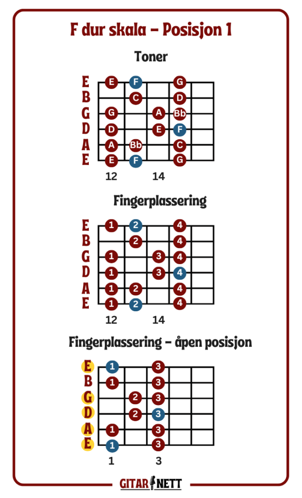 Lær deg å spille F dur skala på gitar – se hvordan du bygger opp skalaen og hvordan du kan spille den.