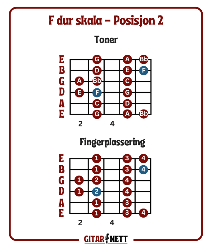 Mønsteret for posisjon 2 starter i 2. bånd på gitarhalsen for F dur skala.