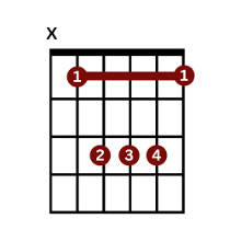 Begynner vi med tonen F på 6. streng kan vi spille igjennom skalaen slik: