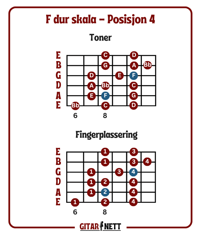 Deretter kommer grunntonen F igjen i 6. bånd på 2. streng.