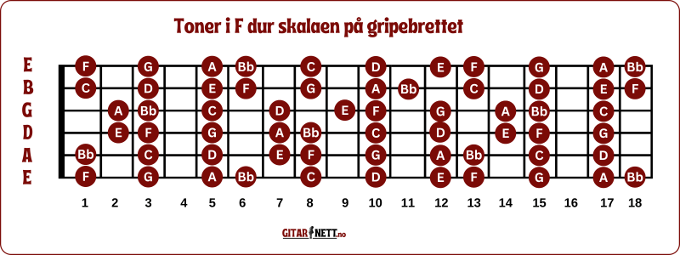 Vi vet at F dur skalaen består av tonene F, G, A, B♭, C, D, E. Du ser hvor du finner disse tonene på gripebrettet her:
