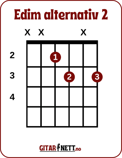 Alternativ 2 for å spille akkorden Edim inneholder en streng som må spilles dempet. Som nybegynner kan dette være kinkig å få til. Så dette grepet passer ikke for alle.