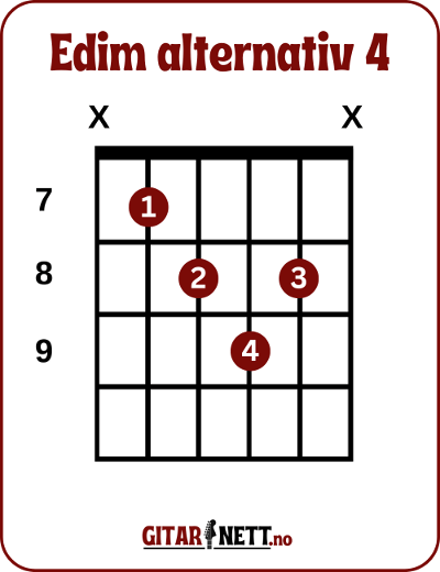 Denne akkorden skrives med betegnelsen Edim eller E°. “Dim” står for “diminished,” så Edim står derfor for E diminished. På norsk kan vi si “E dim.”
